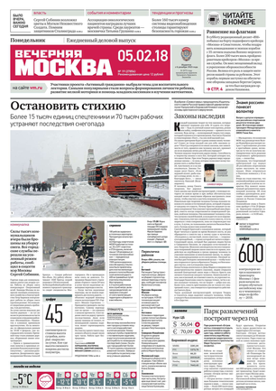«Вечерняя Москва» — ежедневная российская вечерняя газета, старейшее из вечерних изданий в России, учрежденное в 1923 году. Выходит пять дней в неделю, кроме субботы и воскресенья. Отличается тем, что рассказывает о событиях еще не завершившегося дня. Оперативно освещает хронику и особенности жизни Москвы, охватывает все слои общества и большинство профессиональных и возрастных групп читателей.Издание представлено тремя выпусками – утренним ежедневным, вечерним (выходит три раза в неделю), еженедельным (выходит по четвергам).