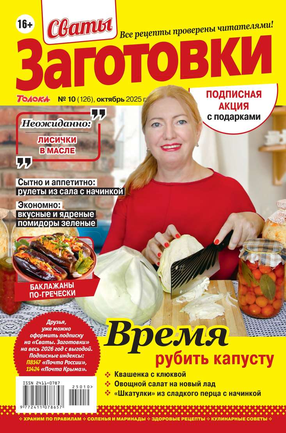 Более 100 рецептов заготовок от Сватов в каждом номере: соленья и маринады, салаты и ассорти, соусы и приправы, заготовки к сезону, сладкие заготовки, напитки, винный погребок, мясные деликатесы, здоровые рецепты, целебные заготовки, дачные хлопоты, правила хранения, а также кроссворды и сканворды для досуга. Лучшими рецептами поделятся с вами сваты Любовь Сергеевна и Михаил Михайлович.